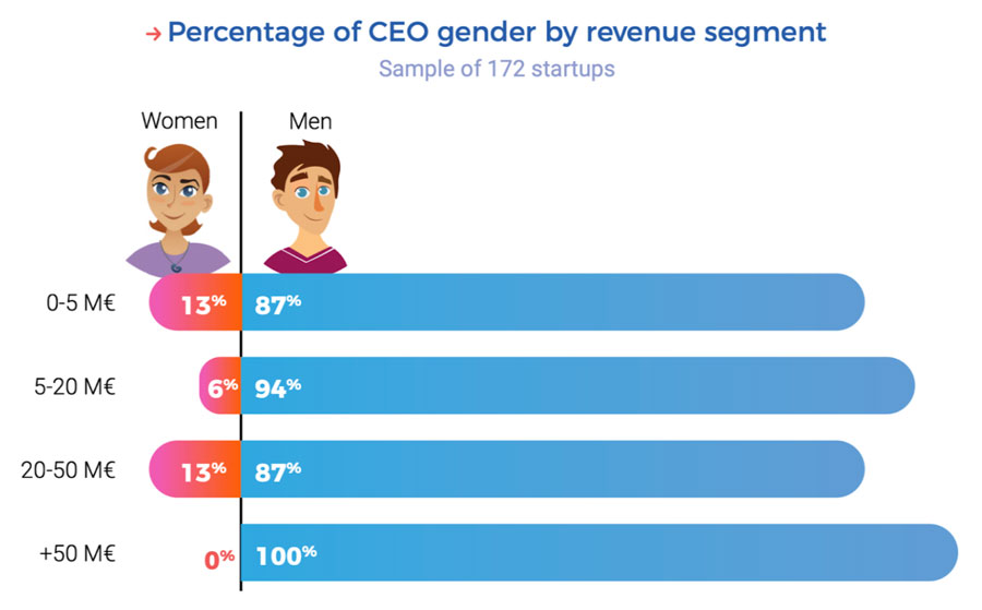 According to data from the Social and Economic Performance of French Digital Start-ups Report, 12% of french tech startup founders are women and only 11% hold a leadership role such as Chief. Not only are there fewer women leading the industry, but also the revenue received by their startups is lower compared to male-founded ones, which means that female-founded startups are less likely to attract investment.
