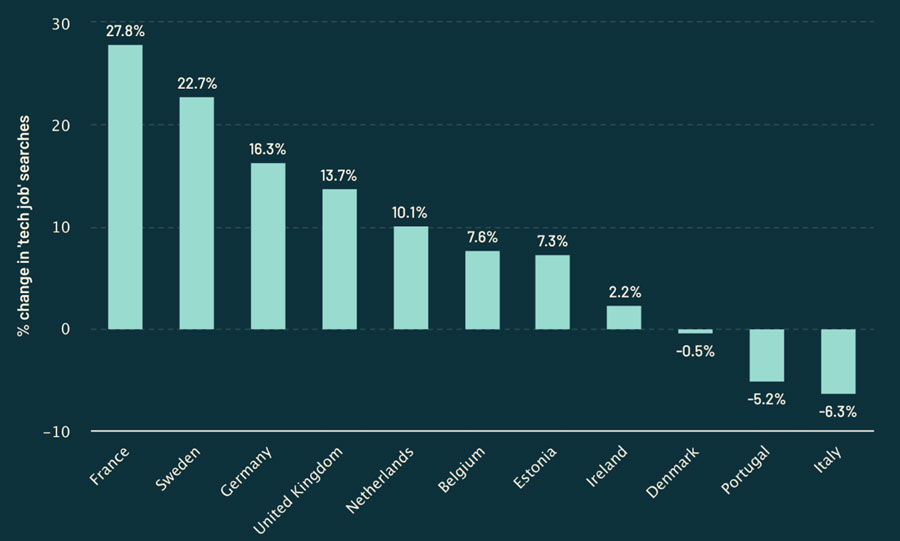 Despite the hardships the European tech industry faces, according to the Atomico France Spotlight report, the overall feeling in France is positive. This optimistic approach to the industry might be behind the increase in searches for tech jobs, which is exceptionally high in France: