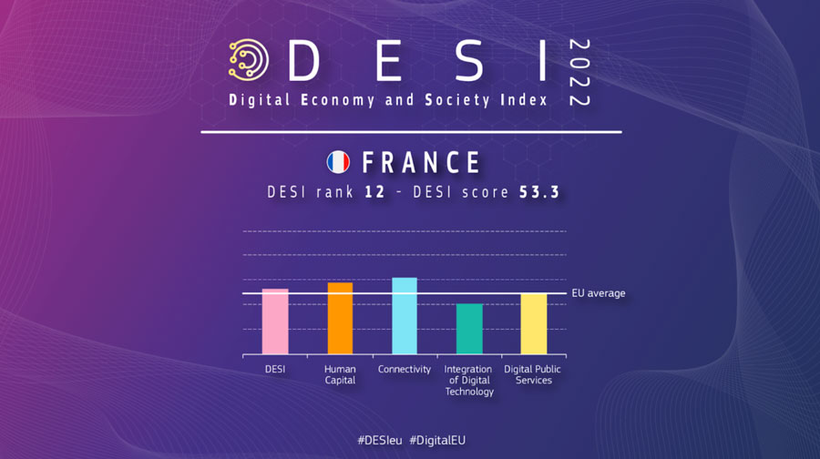 According to the Digital Economy and Society Index (DESI index), France is considered a strong innovator, and although its position is good, it is below the average of the European countries in this category. France occupies the 12th in the index, with a 53.3 score: