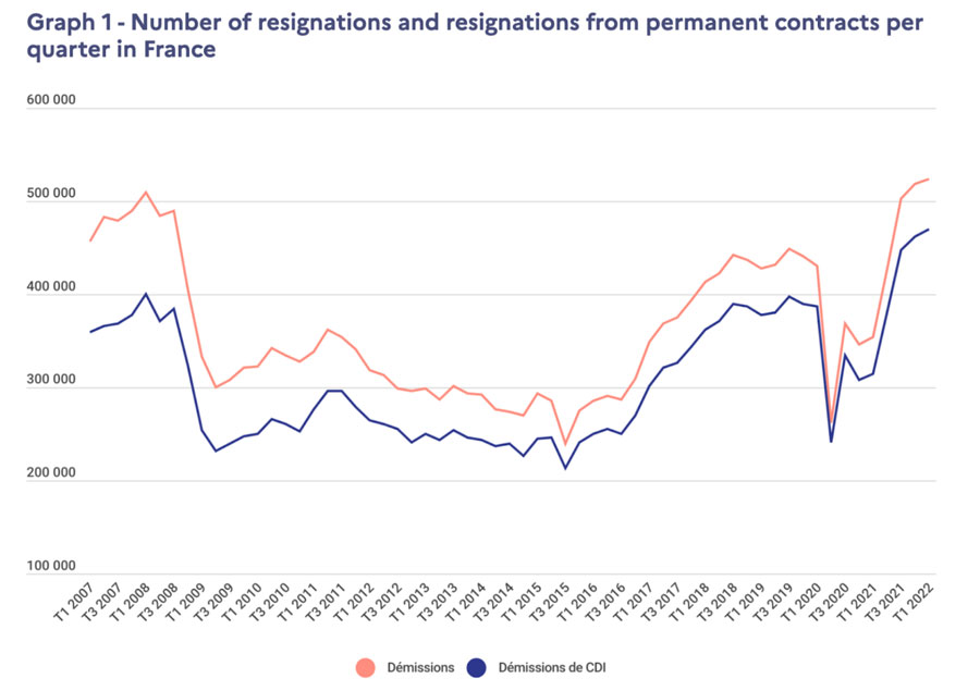 France is not extemp from the consequences of this trend. At the end of 2021 and the beginning of 2022, there was a historically high level of resignations, with approximately 520,000 resignations per quarter, including 470,000 from permanent contracts.