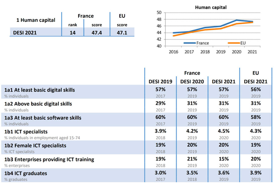 According to the Digital and Economy and Society Index, France ranks 12th in Europe in terms of human capital, which is above the EU average: