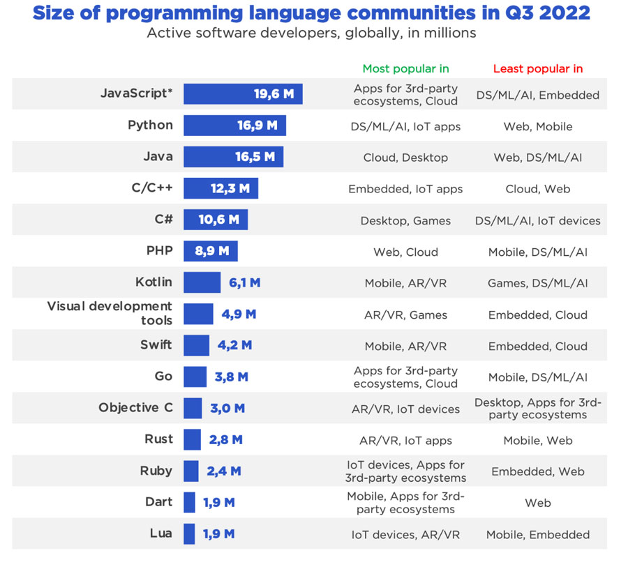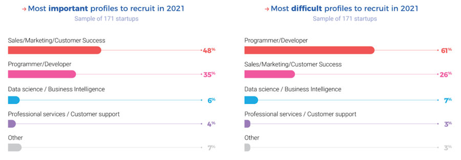 In Barometre France 2021, 61% of startups surveyed claimed that the most difficult roles in recruiting are programmers and developers. This shortage, both in general and specialised roles, is expected to grow in 2023.