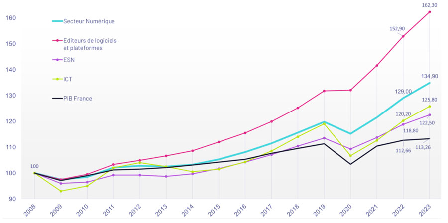 This chart represents the growth of the digital tech industry in France between 2008 and 2023: