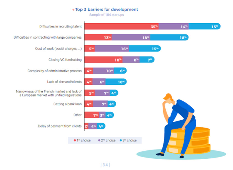According to the France Digitale report, 70% of startups claim that retaining talent is one of their main obstacles. Among the main concerns for the future and barriers that startups have to overcome, keeping talent is listed in the first position: