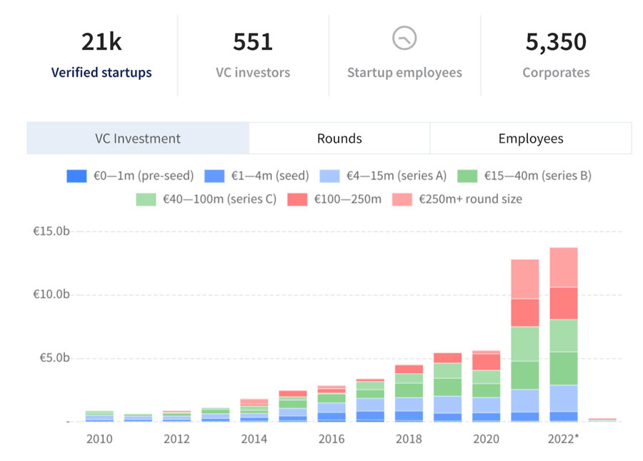 France boasts one of the largest startup ecosystems in Europe, characterised by a well-rounded environment with support from both the government and private sector, a highly skilled workforce, and a broad ecosystem that extends beyond the capital city of Paris. The capital, however, continues to play a significant role in the evolution of the startup scene in the country and is also considered a leader in the European startup scene. The French startup ecosystem has seen rapid growth in recent years, particularly since 2019. There is significant support for investment in the startup industry, leading to a relevant number of unicorns (startups that are valued at over 1 billion). According to data from La French Tech, French startups have been rising since 2010 and have seen exponential growth in the last two years, particularly in startups with investment rounds between €14-250m+.