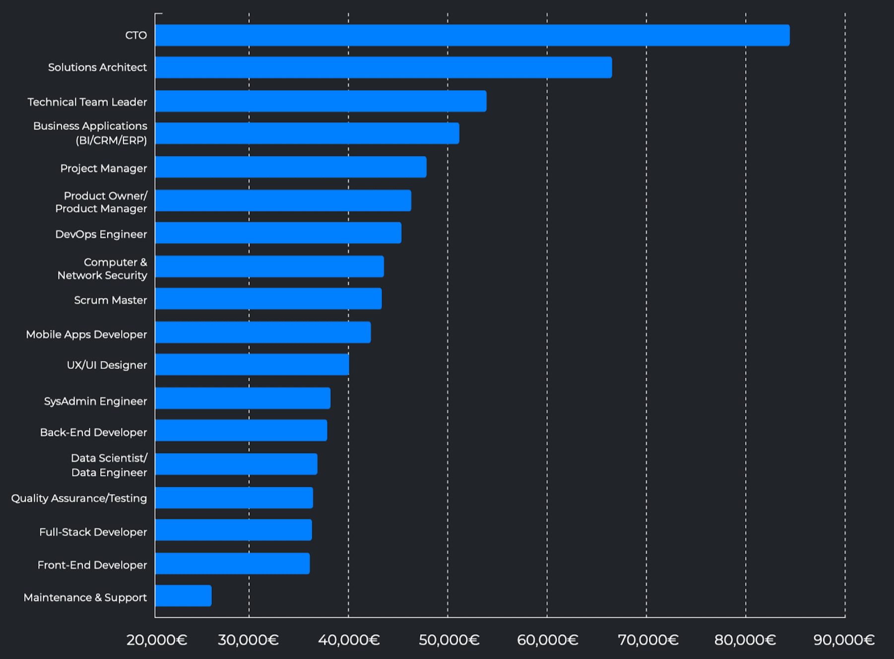 According to Adecco, salaries for developers and analysts can range from 30.000€ to 40.000€. Different IT positions are highly coveted; for example, Cybersecurity specialists can earn up to 60,000€.