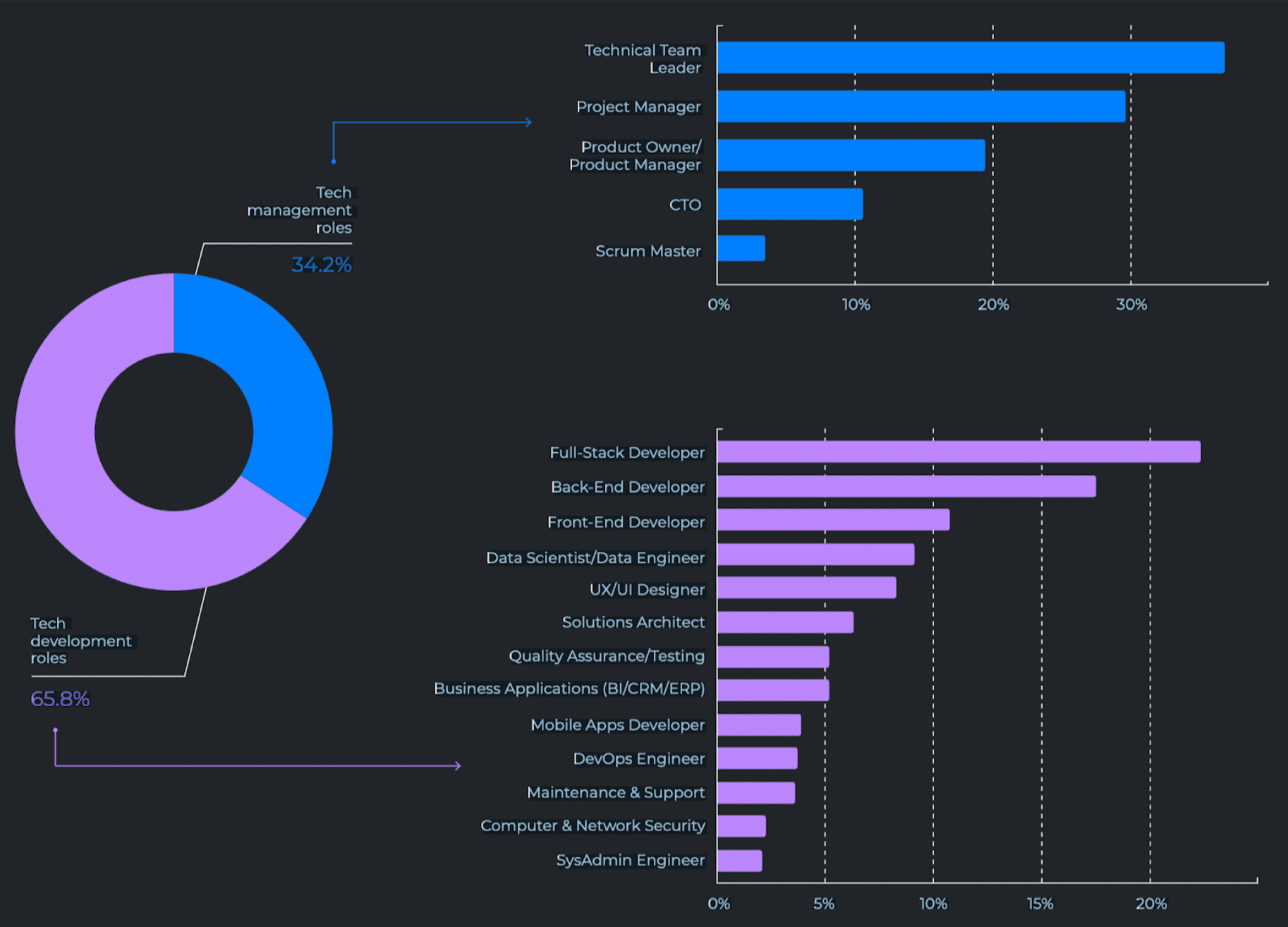 Leadership and project management skills-oriented roles were next on the list, representing 25% of the overall vacancies, followed by other tech positions such as Technical Team Leader, Project Manager, Product Owner/Product Manager, and Scrum Master.