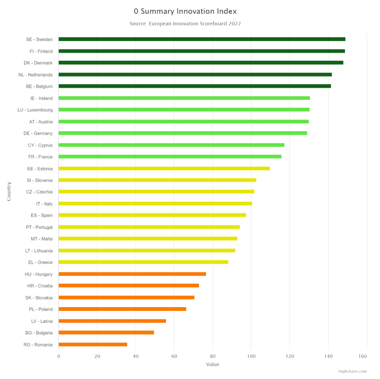 According to the European Innovation Scoreboard 2022, Portugal is considered a Moderate Innovator with 85.8% of the EU average performance. Over the last six years, Portugal’s performance has increased by 6.4%, but compared to Europe’s average increase (9.9%) indicates that there is still a significant gap between Portugal’s performance and the average European country. This scoreboard shows that Portugal still has room for improvement.